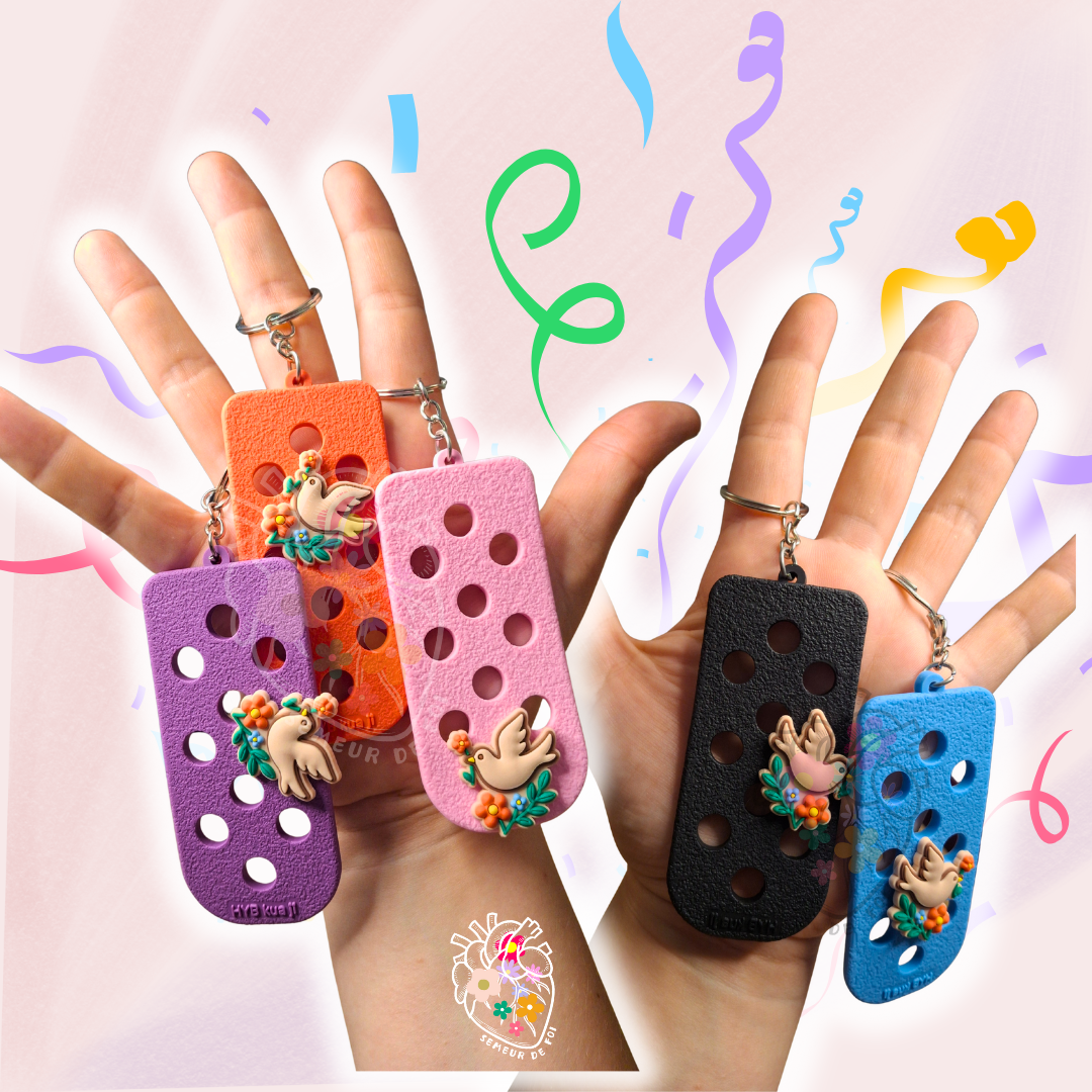 Ajoutez une touche de couleur et d’originalité à votre quotidien avec ce porte-clés. Conçu dans une matière résistante et légère, il se fixe facilement à vos clés, sacs ou baskets. Son design perforé offre un style moderne et peut être personnalisé avec différents charms (colombe, symboles, décorations florales). Les charms sont optionnels et non systématiquement inclus.